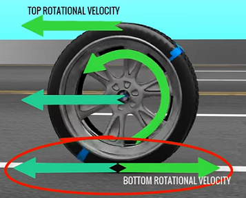 Velocity at the center contact area of wheel should be zero so that there will not be any slippage between the stationary road and the wheel at the contact point. In order to achieve zero velocity at moving point the transitional velocity should cancel the bottom rotational velocity. they should act in opposite directions on straight line.